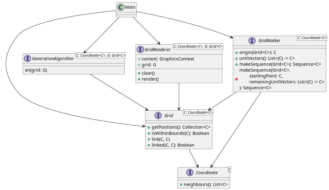 La classe Main accède à la plupart des composants. C'est son rôle de faire le lien entre les différentes parties de l'implémentation. Les interfaces Coordinate, Grid, GridWalker et GenerationAlgorithm ont été décrites dans l'article précédent. Résumons rapidement leurs responsabilités.
