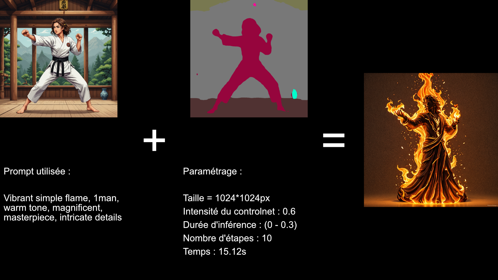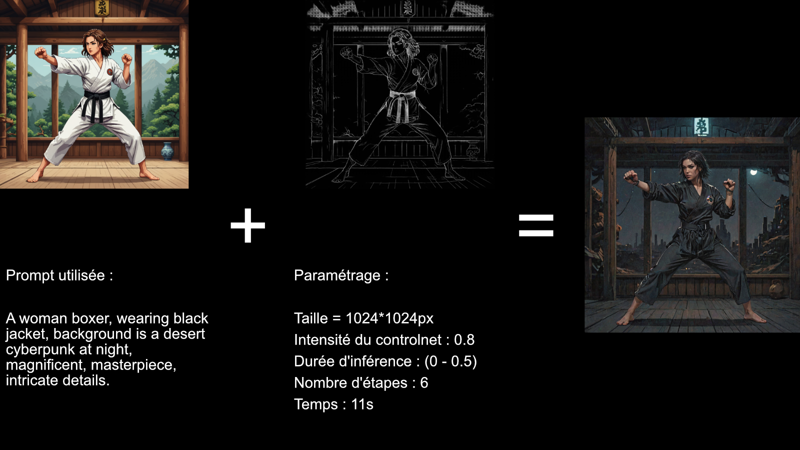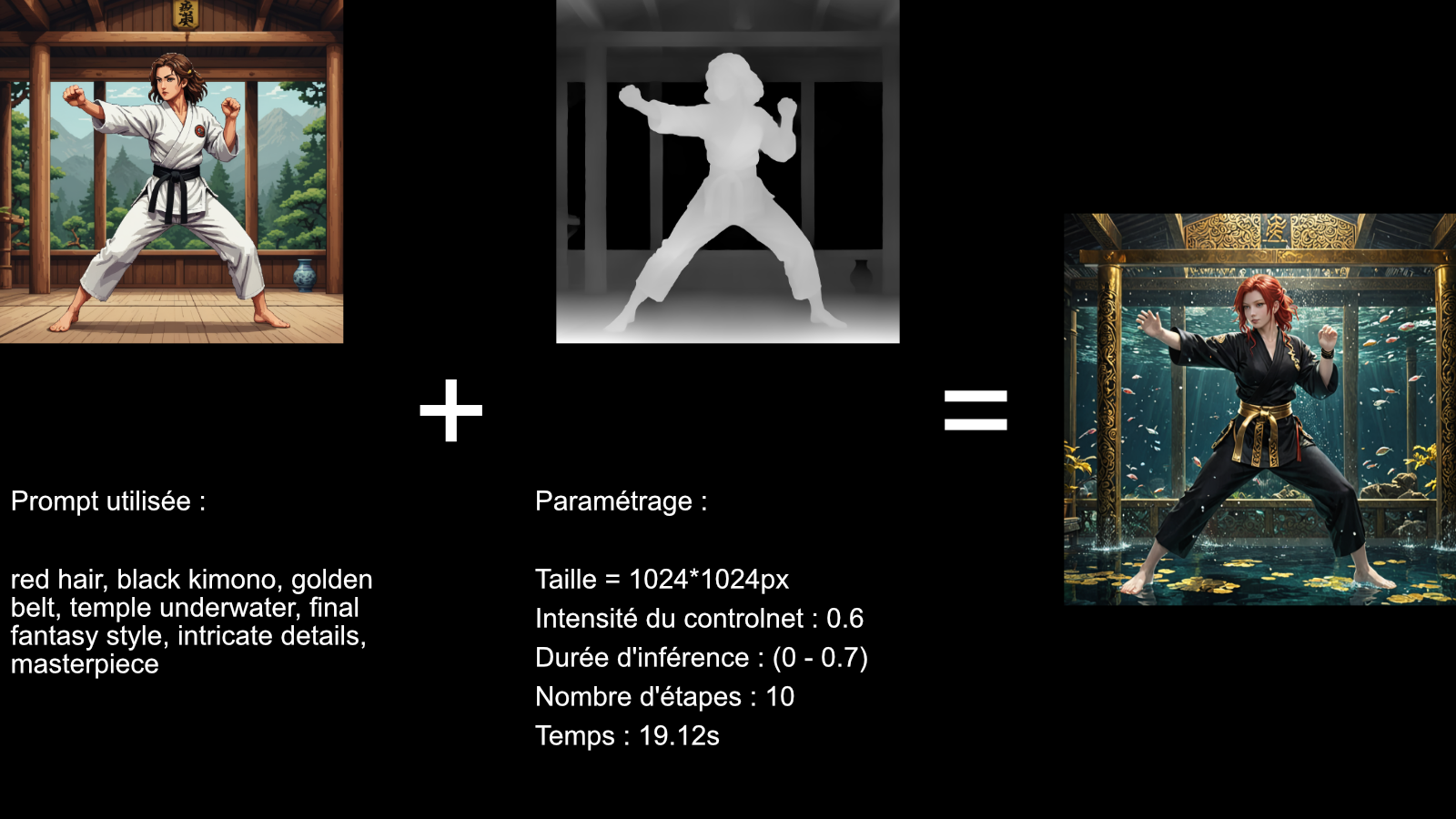 Ici on voit que l'on a pu faire des changements importants (la couleur de cheveux, le kimono, la ceinture, le background etc), sans toucher à la structure de l'image.