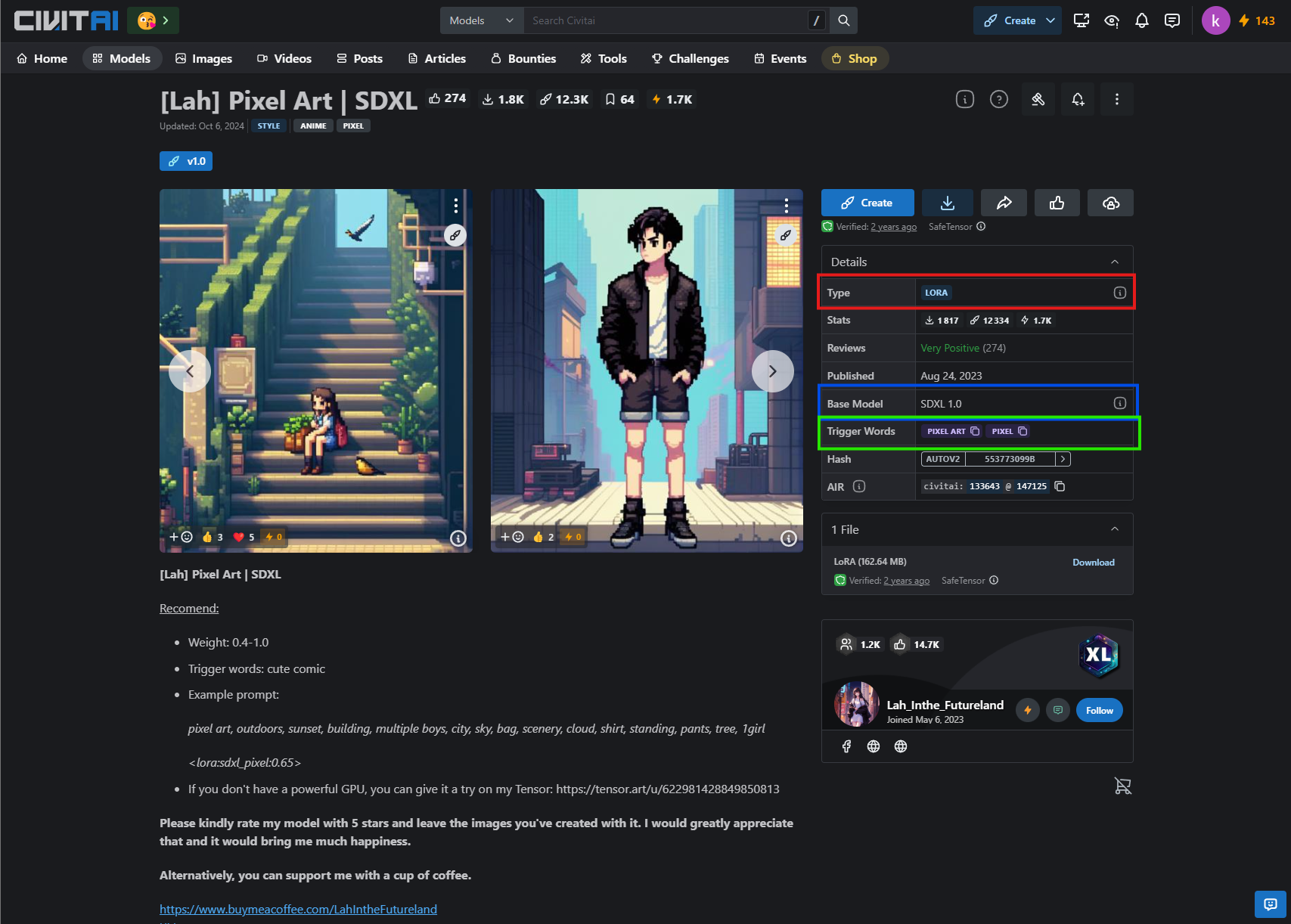 Une fois ceci fait, vous pouvez aller sur le site civit.ai, pour trouver un LoRA qui vous fait plaisir. Pour notre exemple nous allons prendre un LoRA pixel art, qui est disponible ici