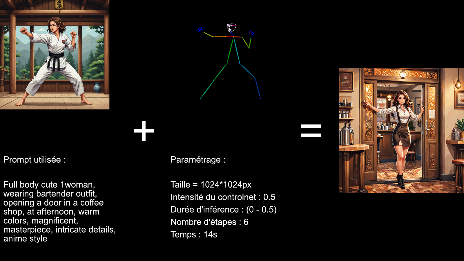 On utilise ici l'algorithme "OpenPose", pour détecter et récupérer les informations de posture du sujet (humain ou animal). Cela peut être super utile pour générer des personnages multiples, ou d'avoir une posture précise pour le sujet.