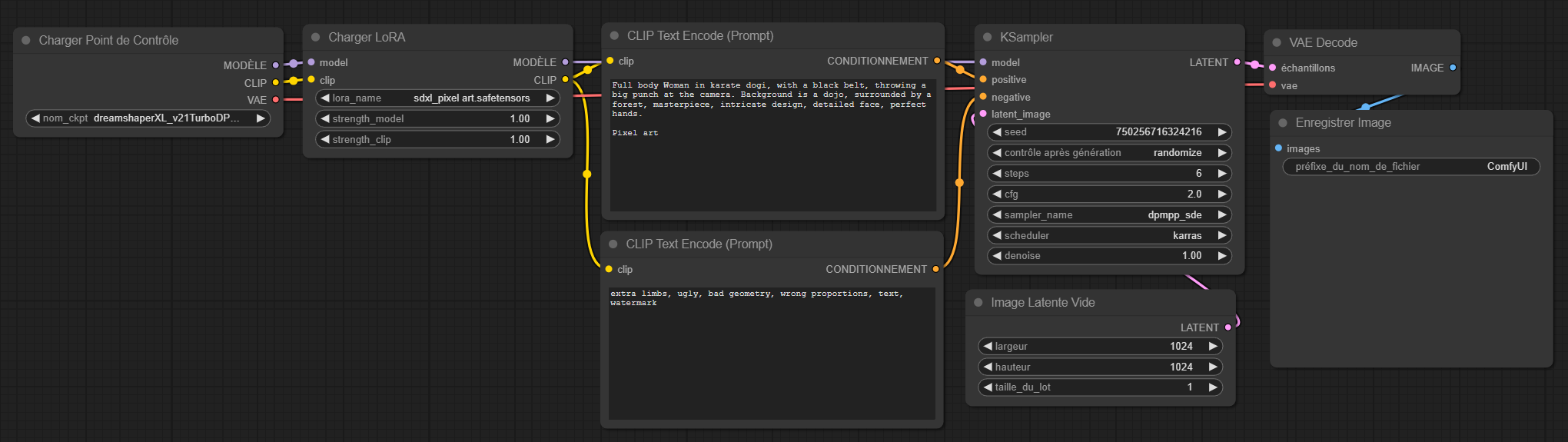 Il suffit ensuite de la connecter aux différents points, donc model, sur le checkpoint et le Ksampler, clip sur la sortie du checkpoint et à l’entrée des prompts. Comme sur l’image ci-dessous.