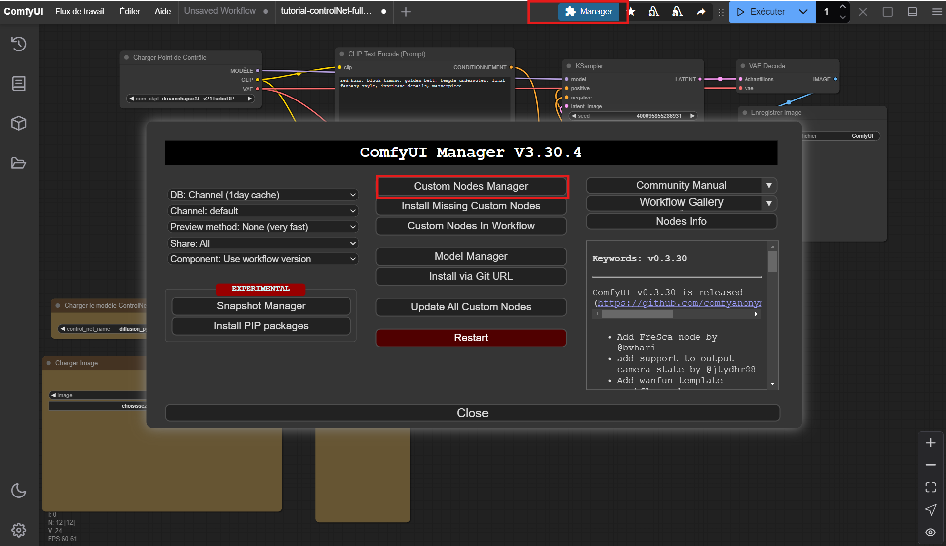 - Télécharger la customNode "comfyui-controlnet-aux", en utilisant le manager, puis dans custom nodes manager, il se trouve ensuite dans la liste