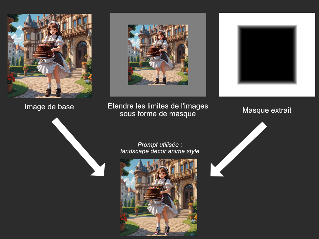 Maintenant que l'on a vu l'inpainting, qui consiste à remplacer l'intérieur d'une image, imaginons que l'on "masque" les bords extérieurs d'une image. Le masque "s'étend". Ce qui permet de créer de l'espace de génération à notre IA ! C'est très pratique car on "imagine", ce qu'il peut y avoir au-delà l'image !