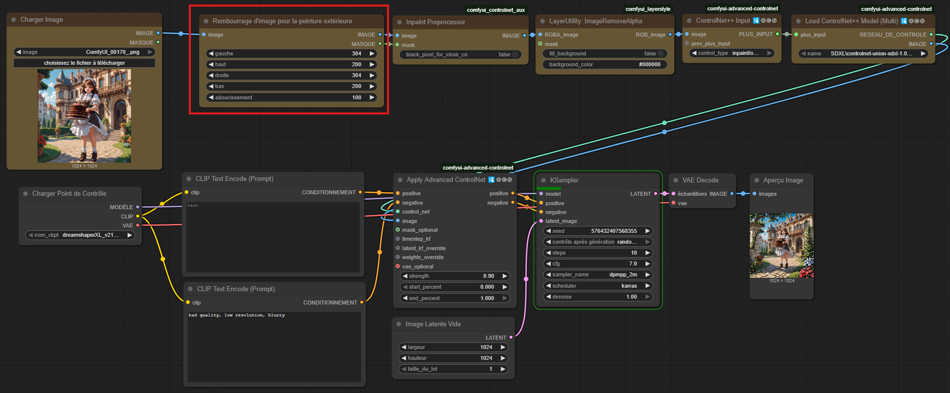 ControlnetInput et LoadControlNet ++ (Multi) : C'est ici que l'on sélectionne le type d'input (donc inpaint/outpaint pour notre cas), et que l'on fournit le modèle prévu. A savoir le controlnet union promax, provenant de la partie précédente sur les controlNet justement !