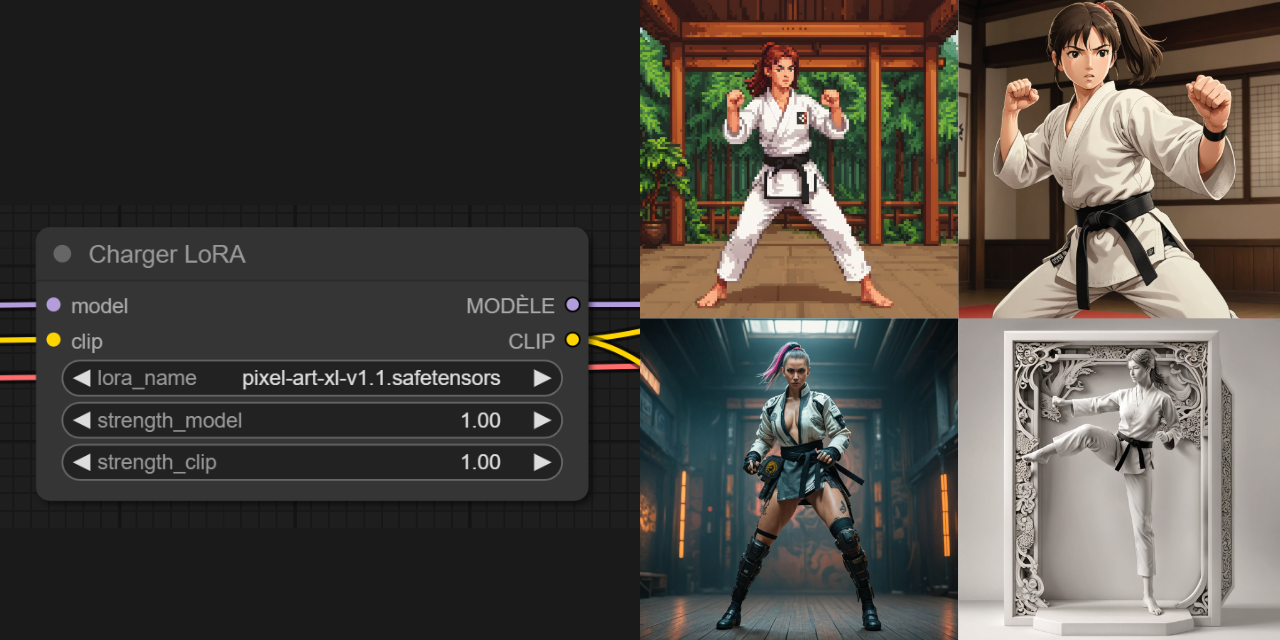 - strength_clip: Pareil que l’intensité du modèle, mais pour le CLIP (le prompt en gros), généralement on peut le laisser à 1, dans la plupart des cas