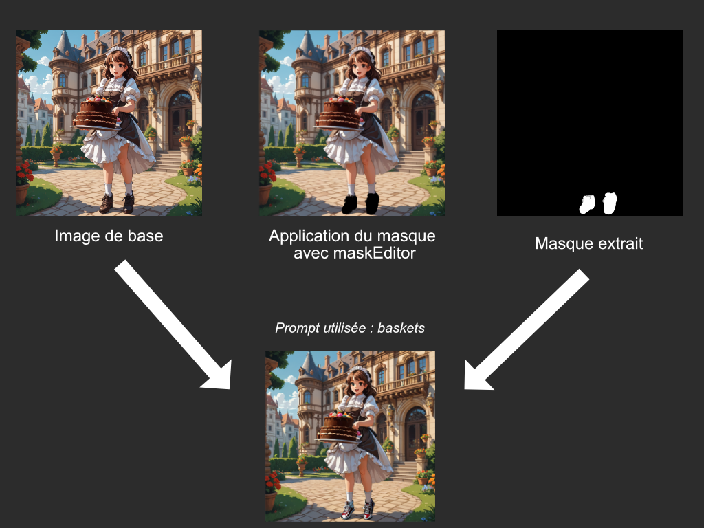 Le principe est super simple, il consiste à masquer la région d'une image, (en très gros, c'est juste remplir une zone de pixels noirs), pour la remplacer par quelque chose d'autre. Mais la partie intéressante de l'opération, c'est que l'on peut faire générer par notre IA, le remplacement de ce que l'on a masqué !