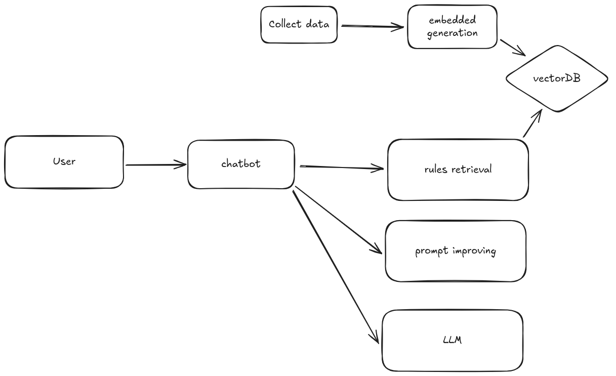 Cette logique permet la création d'une application avec un chatbot pour l'utilisateur qui lui donne la possibilité d'interroger directement les règles. Le chatbot aura ainsi un rôle d'orchestrateur.