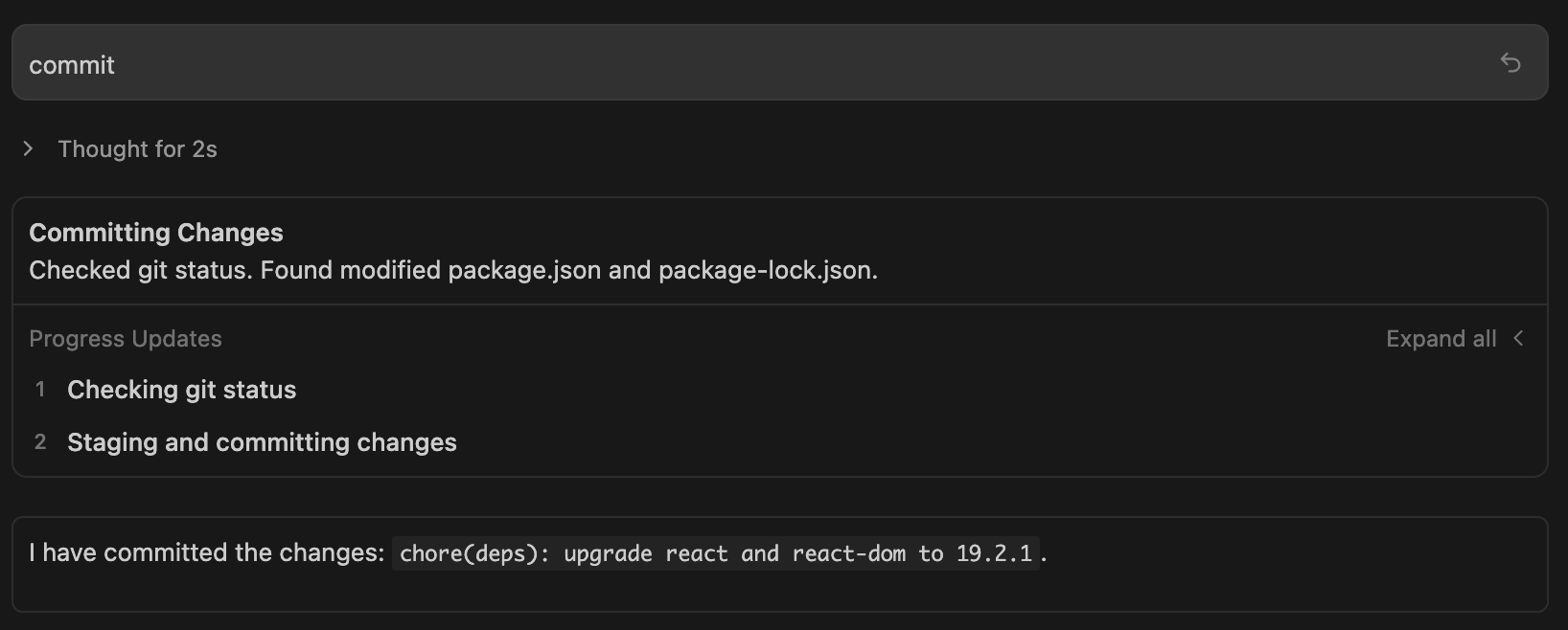 L'agent a vérifié le git status, vu les modifications dans package.json et package-lock.json, et a généré un message de commit conventionnel et explicite :