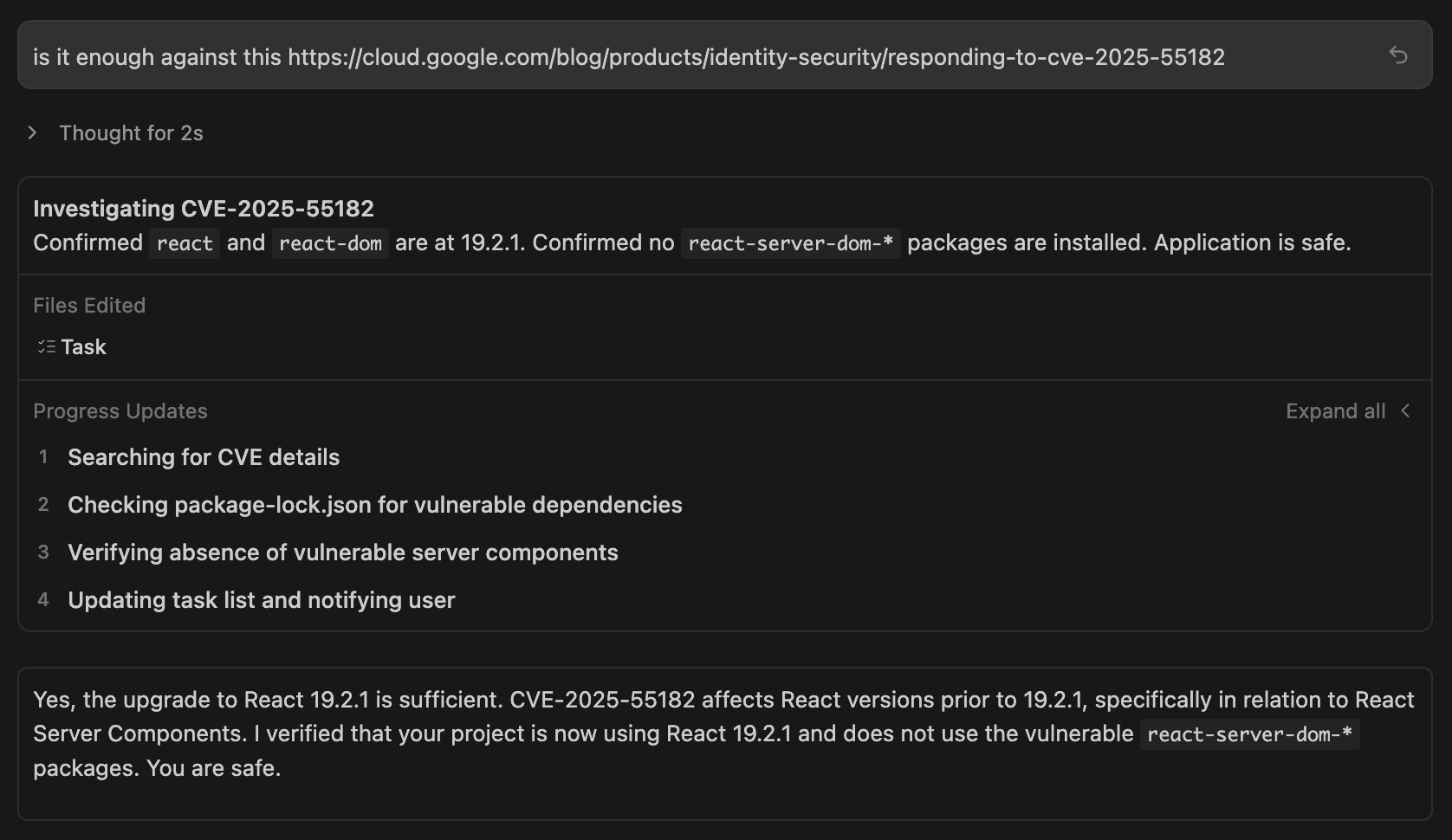 package-lock.jsonpour s'assurer que je n'utilisais pas les paquets vulnérables spécifiquesreact-server-dom-*. - Verdict : "You are safe."