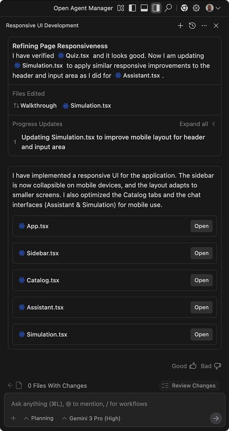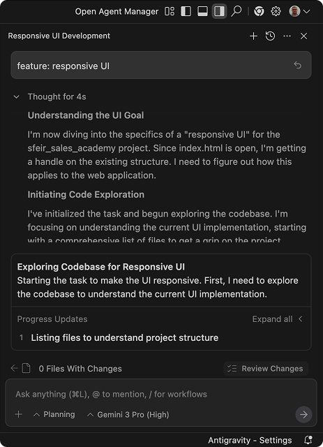- Exploration contextuelle : Il ne s'est pas contenté de deviner. Il a explicitement déclaré : "I'm now diving into the specifics of a 'responsive UI' [...] Since index.html is open, I'm getting a handle on the existing structure".