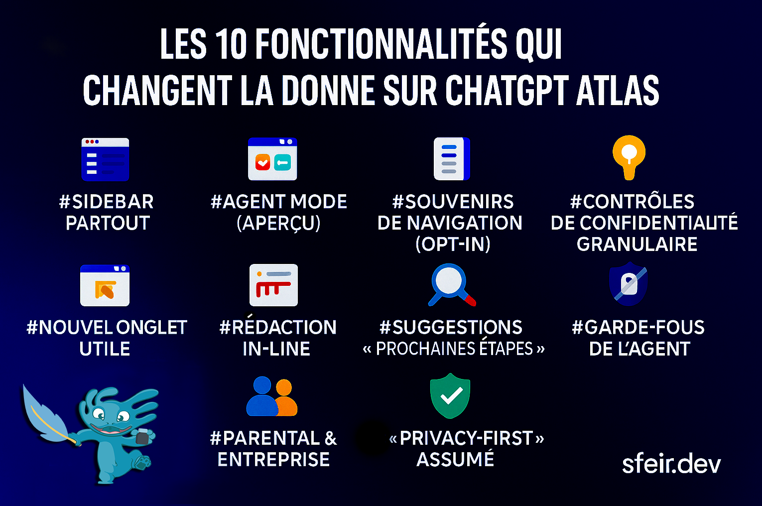 - Atlas (OpenAI) : IA intégrée, mode agent, achat in-app, mémoire opt-in.