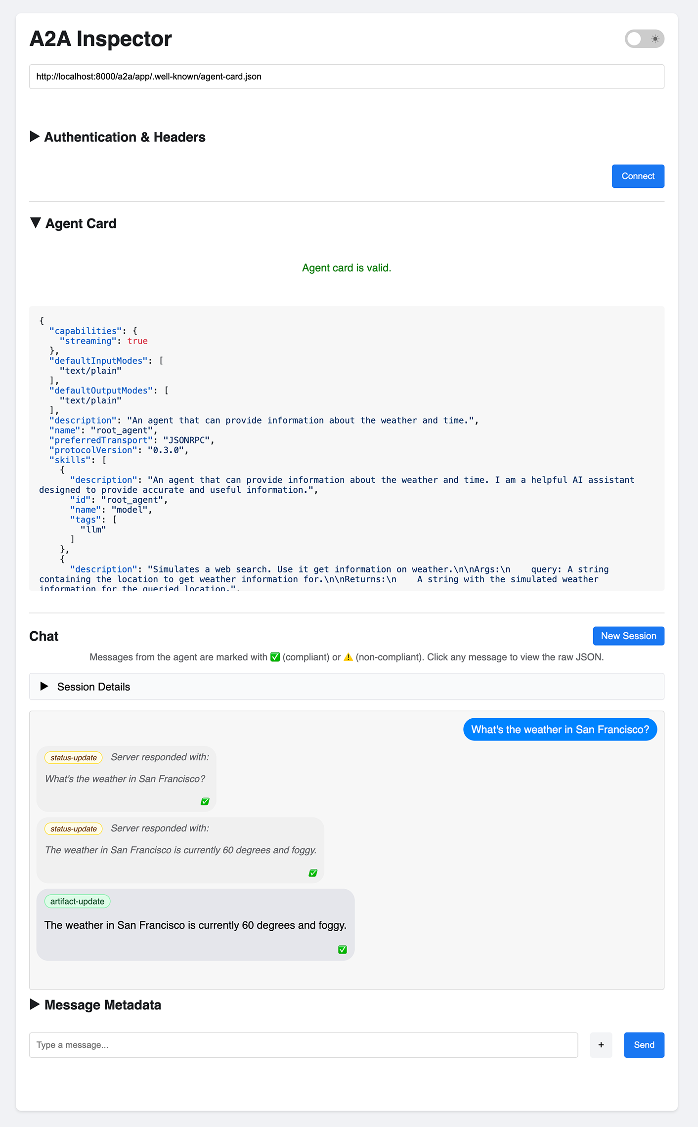 Cette commande lance l'interface "A2A Inspector". Elle permet de visualiser l'Agent Card (la fiche d'identité qui décrit les capacités de l'agent à Gemini) et de tester le chat.
