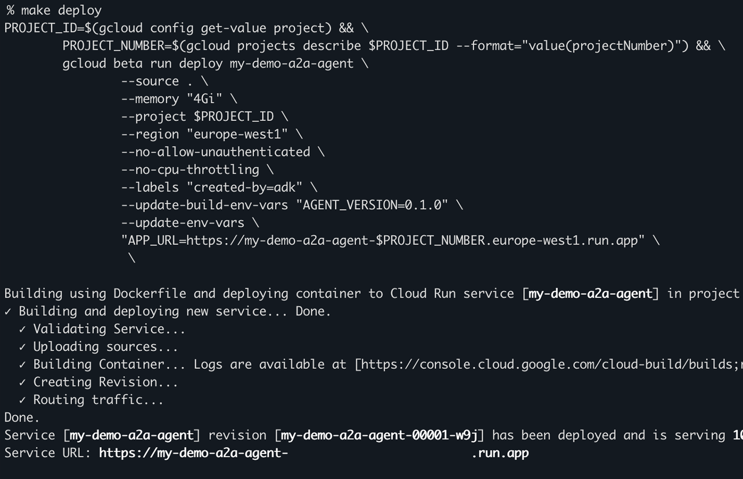 Une fois l'agent validé localement, nous passons à la production. Le déploiement est entièrement automatisé : make deploy