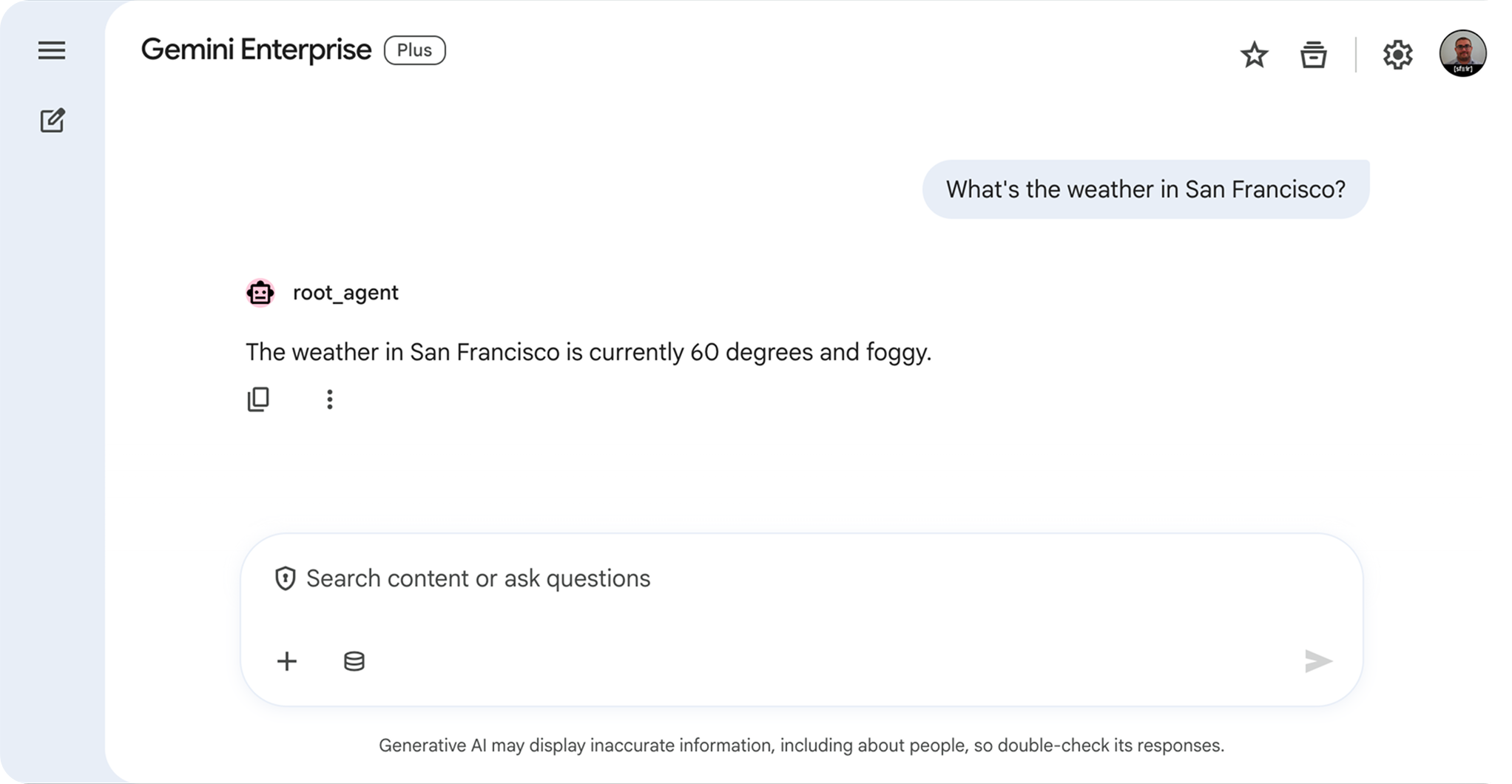 En posant la même question que lors des tests locaux ("What's the weather in San Francisco?"), Gemini identifie que cette requête relève de la compétence de votre nouvel agent. Il le sollicite de manière transparente et vous restitue la réponse exacte.