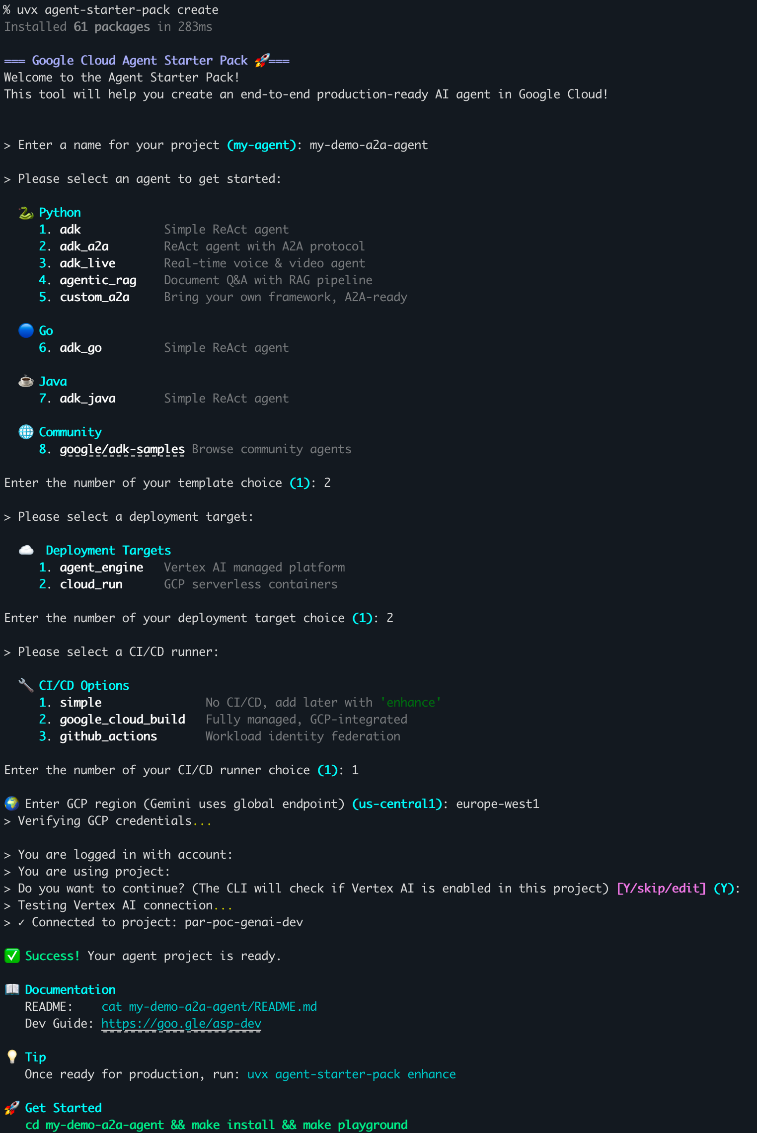 Tout commence dans votre terminal. L'Agent Starter Pack permet d'initialiser le projet instantanément via une simple commande : uvx agent-starter-pack create