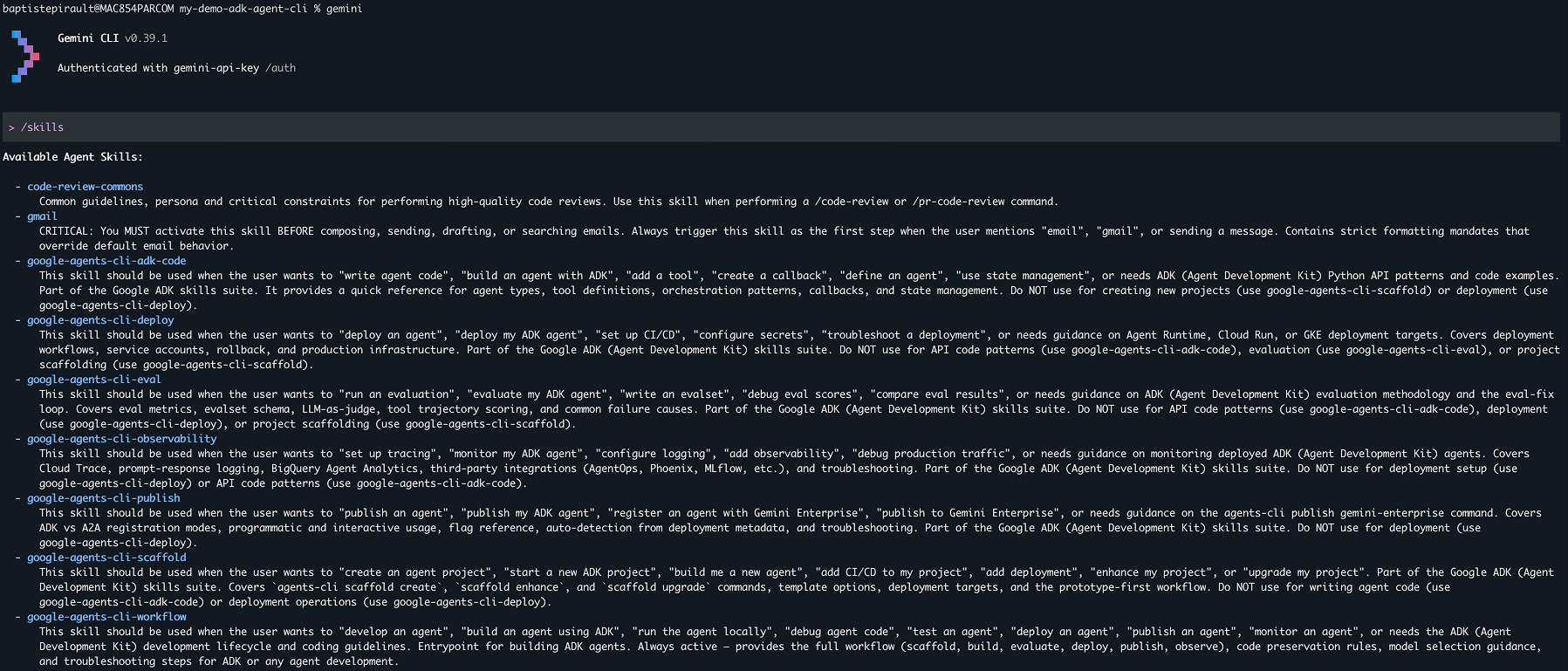 Direction le terminal, je lance gemini dans un dossier vide. Première vérification avec la commande /skills : tous les skills google-agents-cli-* sont bien listés et prêts à l'emploi.