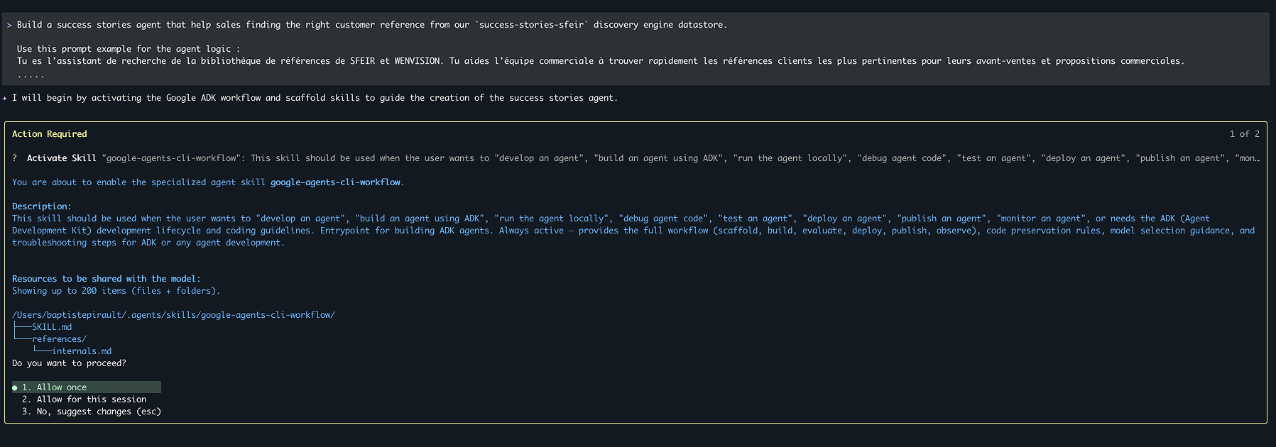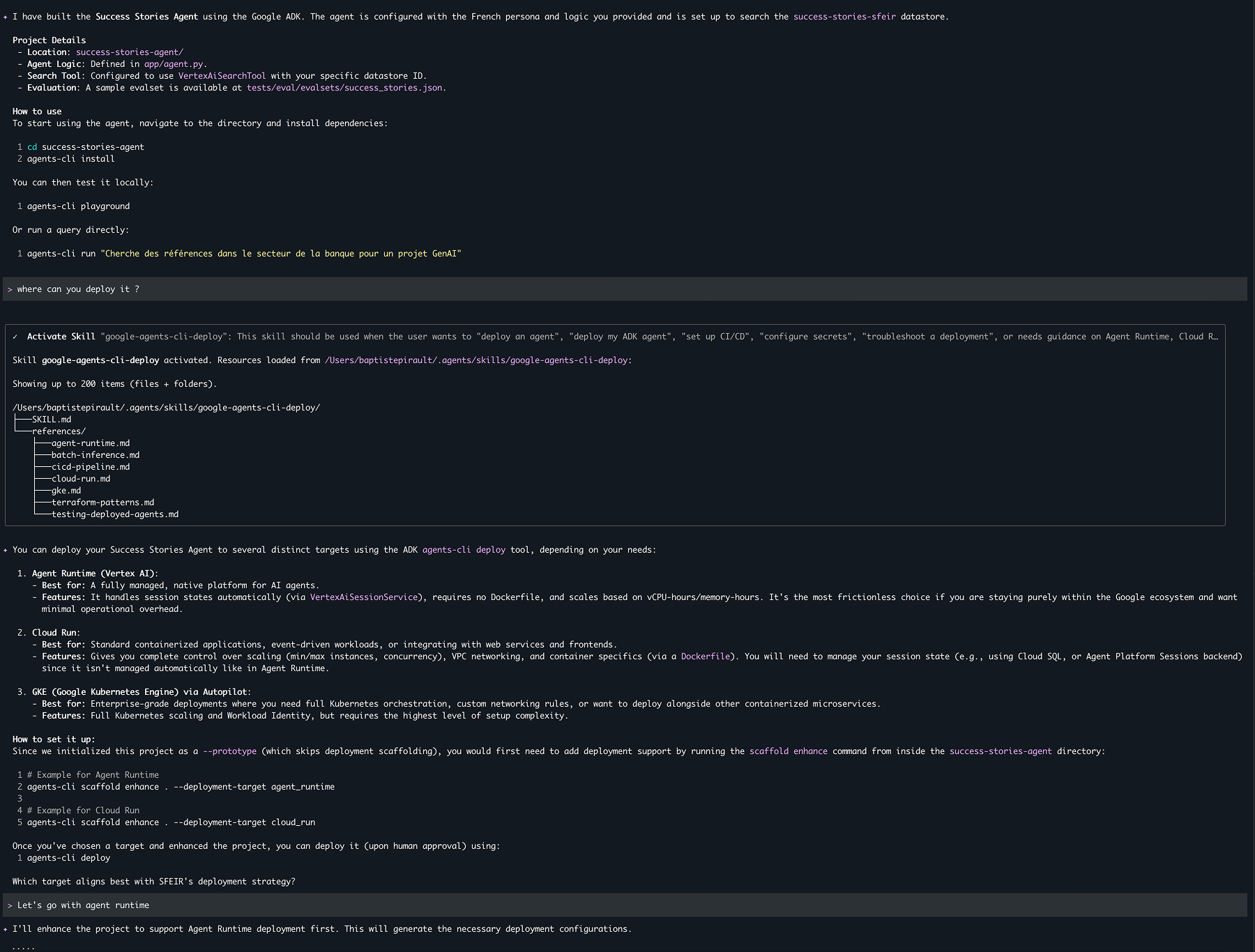 C'est là que la mécanique devient intéressante : je n'ai plus à connaître la syntaxe exacte de agents-cli. Je décris simplement mon besoin en langage naturel, et le coding agent active dynamiquement le skill pertinent.