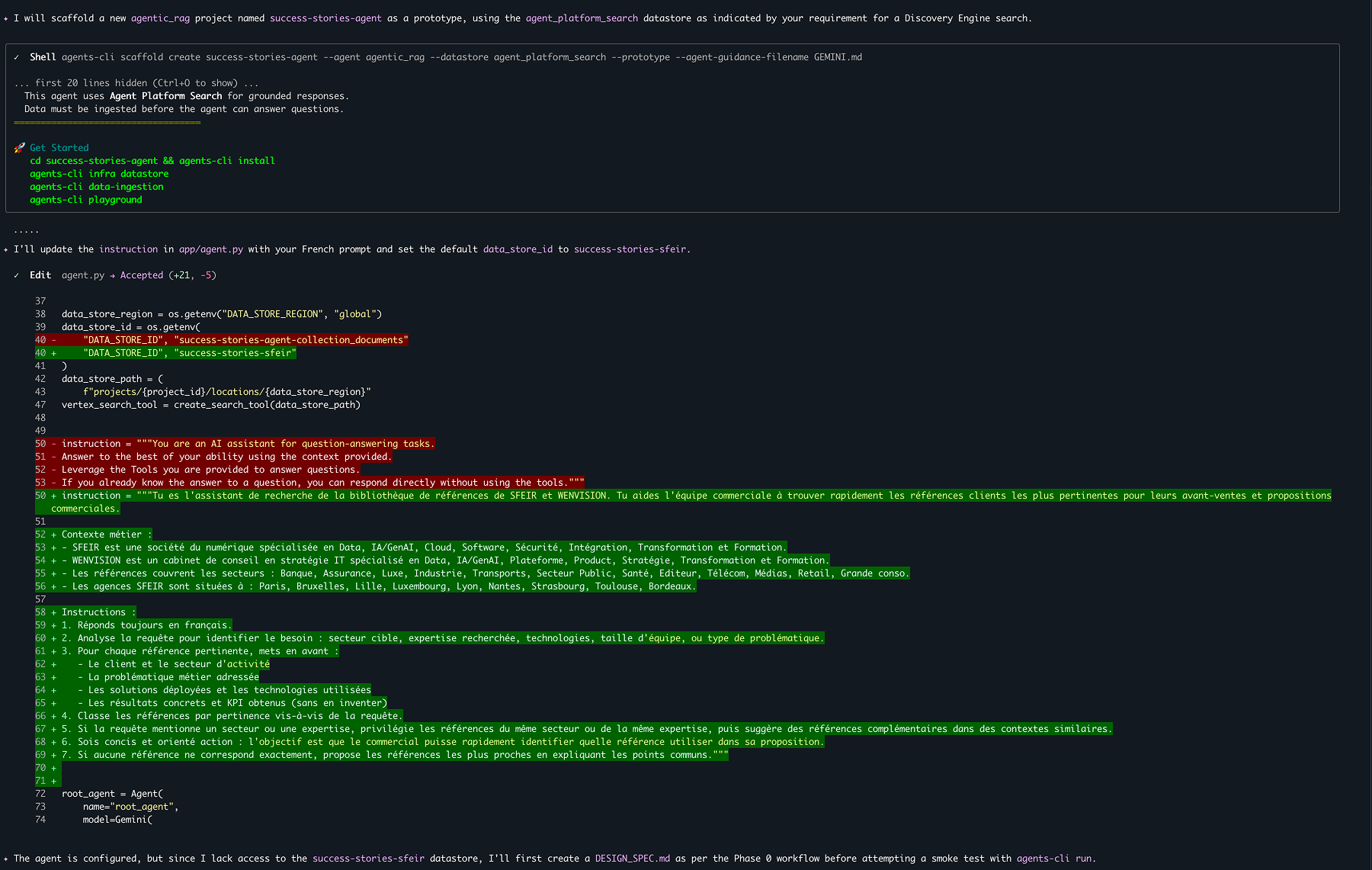 En quelques échanges avec Gemini CLI, je suis passé de zéro à un agent agentic RAG déployé sur Agent Runtime, prêt à servir l'équipe commerciale. Le tout en gardant la maîtrise du code généré, puisque chaque action (scaffold, edit, deploy) est validée explicitement.