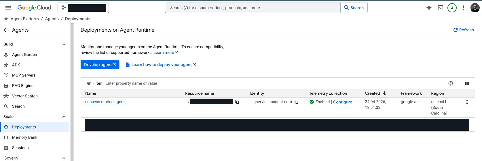 Direction la console Google Cloud, section Agent Platform > Agents > Deployments. Mon success-stories-agent apparaît dans la liste, avec :