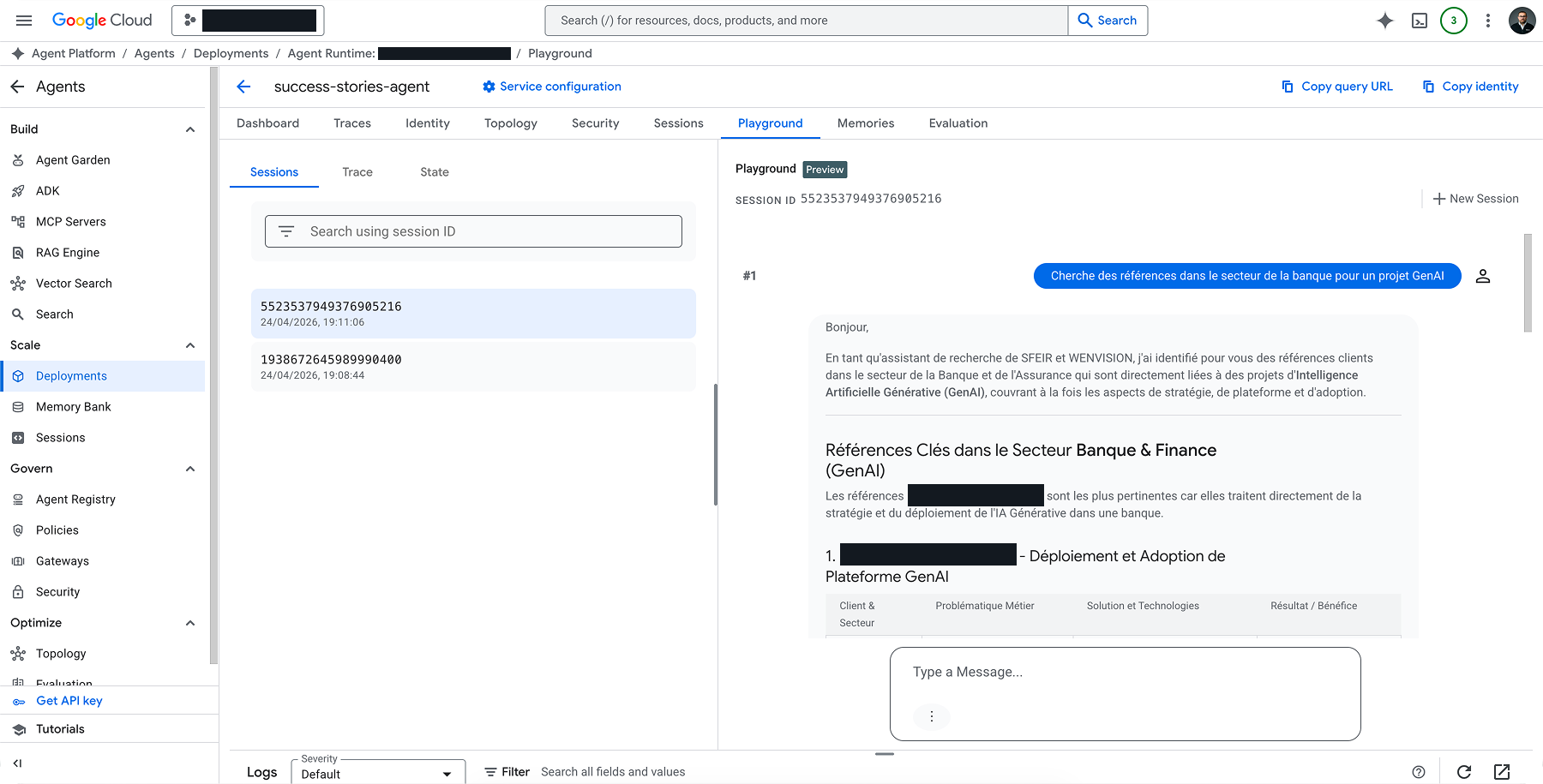 L'agent répond en français, structure sa réponse avec un tableau (Client & Secteur, Problématique Métier, Solution & Technologies, Résultat) et met en avant les références les plus pertinentes du secteur bancaire. Le grounding sur le datastore success-stories-datastore fonctionne du premier coup.