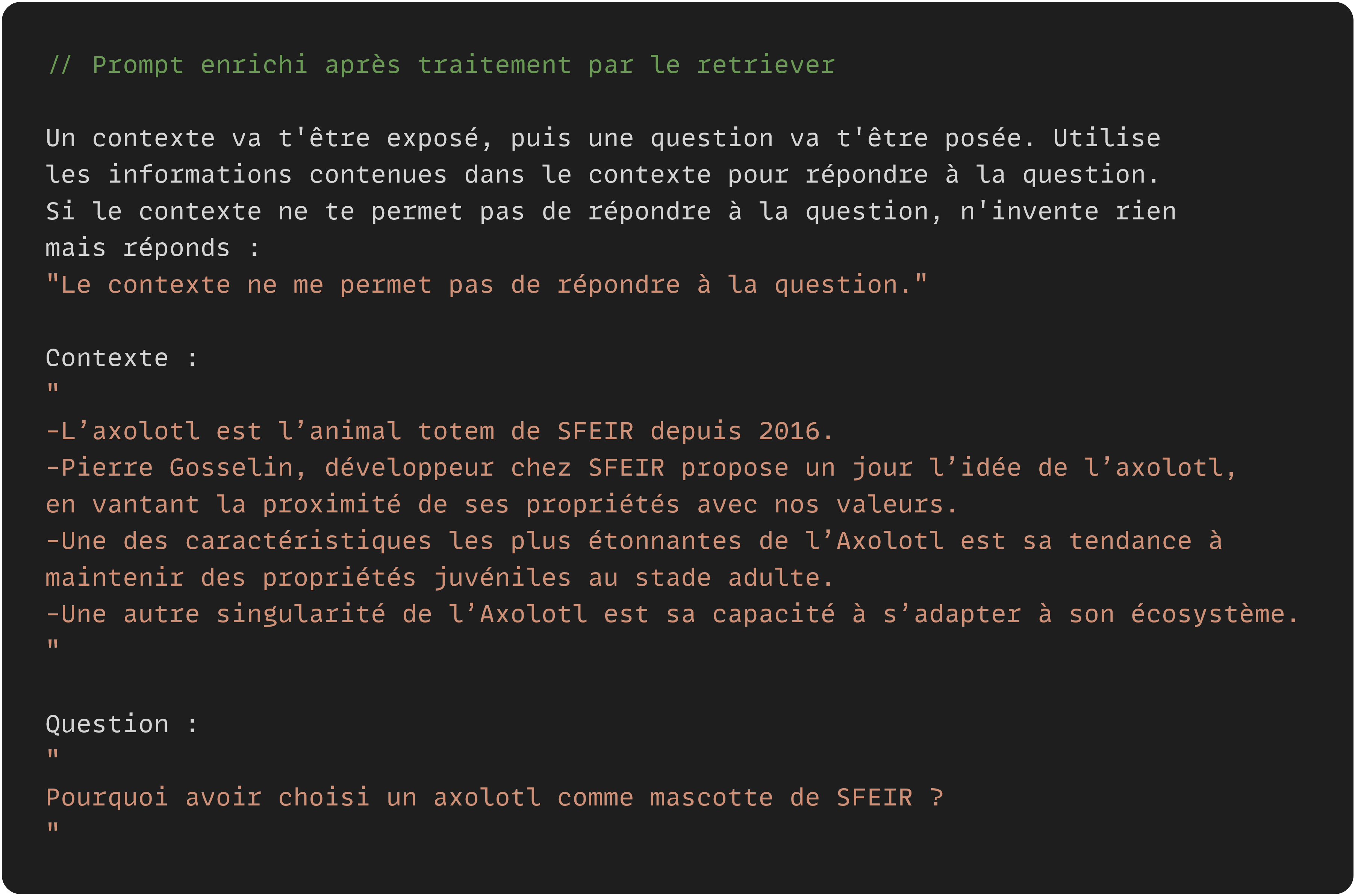 - Une recherche d'information pour agrémenter le prompt et apporter du contexte à la question de l'utilisateur. Ce composant du RAG est le "Retriever", que l'on peut traduire par "chien de chasse" ou "renifleur de bonnes infos".