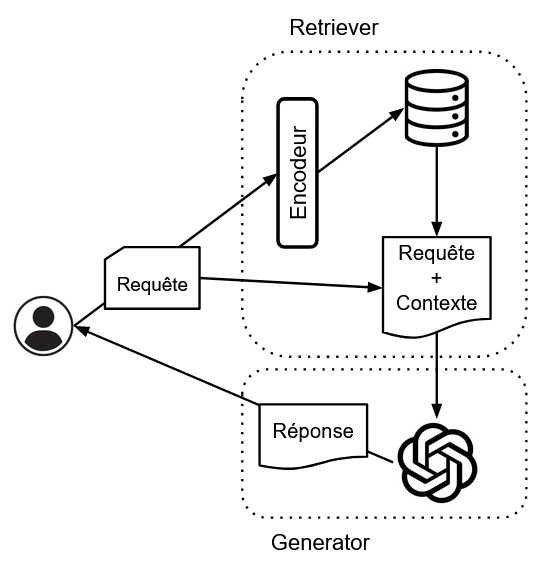 - Une partie de création de la réponse, assurée par un LLM. Cette partie d'utilisation du contexte, construction et formulation de la réponse est la partie "Generator".