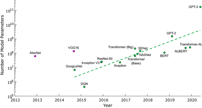 Cependant, plus le problème à traiter est complexe, plus le réseau doit avoir de couches et de neurones, et donc de poids. Bien que certaines tâches ne nécessitent que des réseaux de neurones de taille raisonnable (ou tout simplement d'autres modèles moins coûteux à entraîner), d'autres tâches nécessitent de très nombreux paramètres.