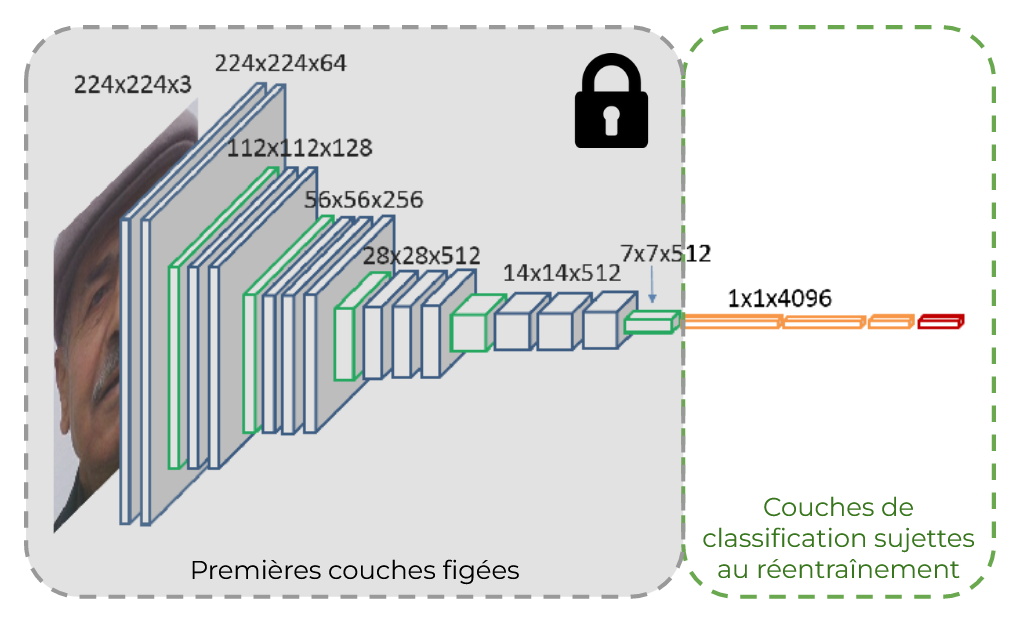 - Les modèles de détection d'image, tel que YOLO, sont structurés en de nombreuses couches ayant leurs propres rôles. Ses premières couches, de convolution et de pooling, permettent au modèle de traiter des images en mimant la vision humaine. Ses dernières couches sont des couches denses (présentées précédemment) qui classifient et localisent les objets dans une image. Les premières couches apprennent généralement à reconnaître des caractéristiques "bas-niveau" (comme les bords, les textures, etc.) et les couches plus profondes extraient des caractéristiques de plus "haut niveau" (comme des formes ou des objets spécifiques). Ce sont ces couches plus profondes, ainsi que les couches denses qui suivent, qui sont ré-entraînées à la nouvelle tâche de détection. Les premières couches, ayant appris à "voir", restent inchangées. On peut citer comme cas d'utilisation la recherche de visages humains dans une image dans le but de les anonymiser.