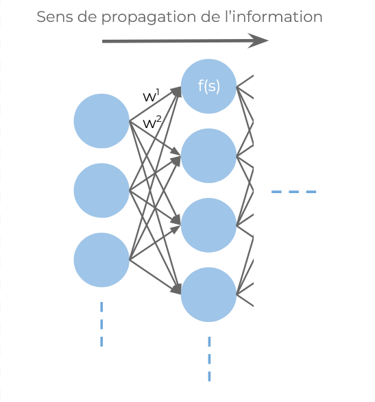 Note : les couches décrites sont des couches "denses" et constituent la base de l'architecture classique des réseaux de neurones artificiels. De nombreux autres mécanismes, types de neurones et manières d'agencer les couches existent et permettent notamment de réaliser des réseaux capables de traiter des images, du son, du texte, etc.
