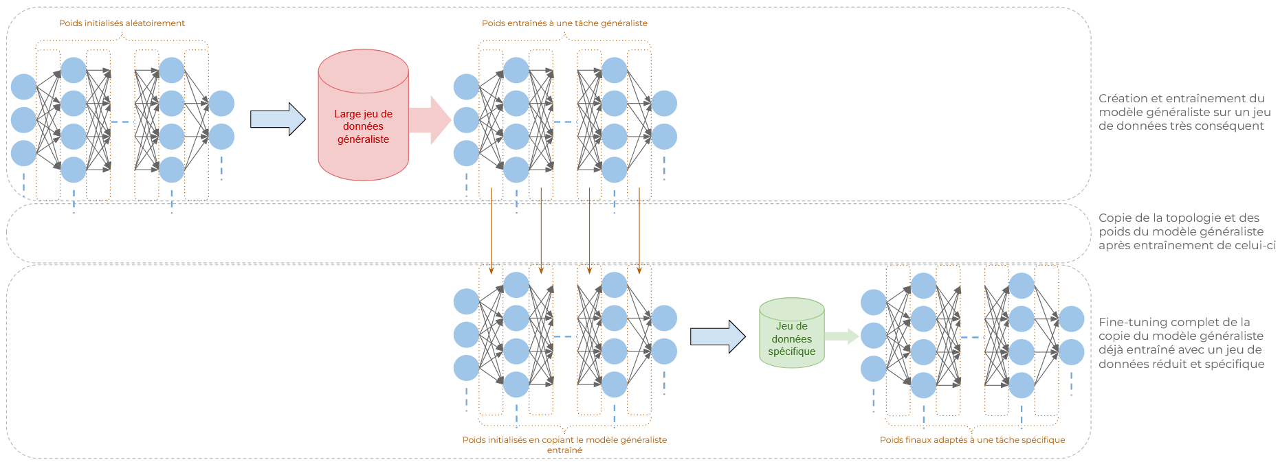 Peut-être avez-vous déjà entendu le terme "fine-tuning" dans le contexte de l'utilisation des LLMs ou du traitement d'images. Le fine-tuning, au sens plus large, désigne le processus d'ajustement des paramètres d'un modèle de machine learning déjà entraîné, en particulier des réseaux de neurones artificiels, à une tâche spécifique. L'intérêt principal du fine-tuning est qu'il permet d'adapter un modèle généraliste à une tâche précise en le ré-entraînant totalement ou partiellement. De plus, ce ré-entraînement ne nécessite qu'une fraction des ressources qu'un développement complet "from scratch" nécessiterait (tant au niveau de la mise en place du jeu de données que de la puissance de calcul).