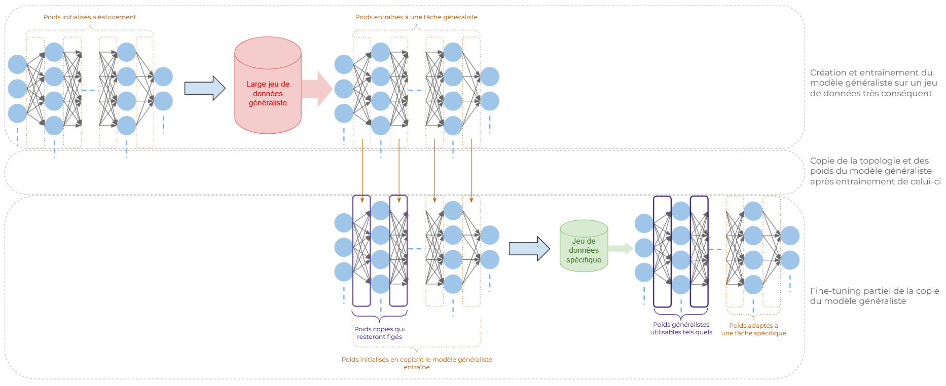 Comme nous venons de le voir, les réseaux de neurones peuvent être très coûteux à entraîner selon la tâche à effectuer, sans compter le temps de mise en place du jeu de données d'entraînement qui, rappelons-le, est constitué de nombreux (milliers, voire millions) exemples de la tâche à réaliser.