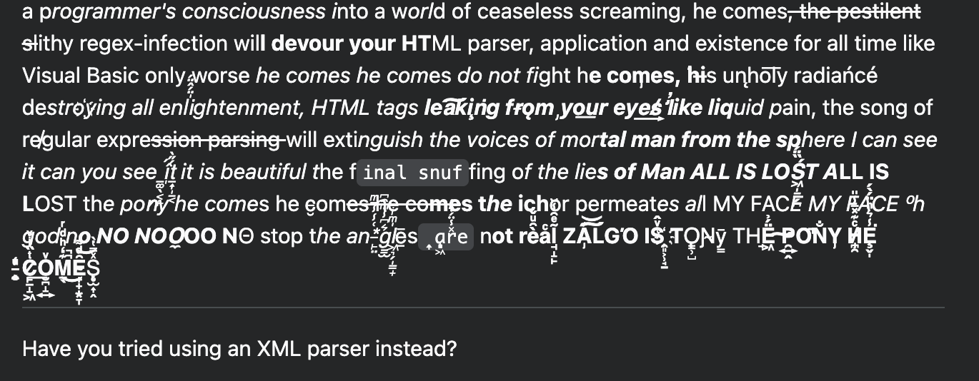 Le texte se désagrège littéralement sous les yeux du lecteur, avec des caractères Unicode « Zalgo » qui corrompent la mise en page, illustrant visuellement la folie qui attend quiconque s'aventure sur cette voie. La conclusion est sans appel : on ne parse pas du HTML avec des regex. Point.