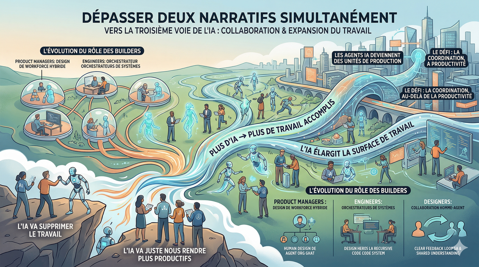 En résumé : Les agents IA sont des workers. L'IA augmente la surface de travail. Les produits deviennent des systèmes de collaboration humain-agent. Et le défi pour les équipes qui construisent ces produits est avant tout organisationnel.