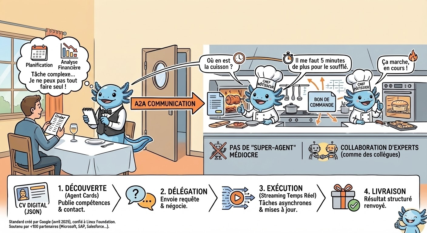 Le Serveur (Agent Principal) prend la commande d'un client. Au lieu d'essayer de cuisiner lui-même, il utilise l'A2A pour s'adresser au Chef Rôtisseur (Agent Spécialisé A) pour la viande, et au Chef Pâtissier (Agent Spécialisé B) pour le dessert.