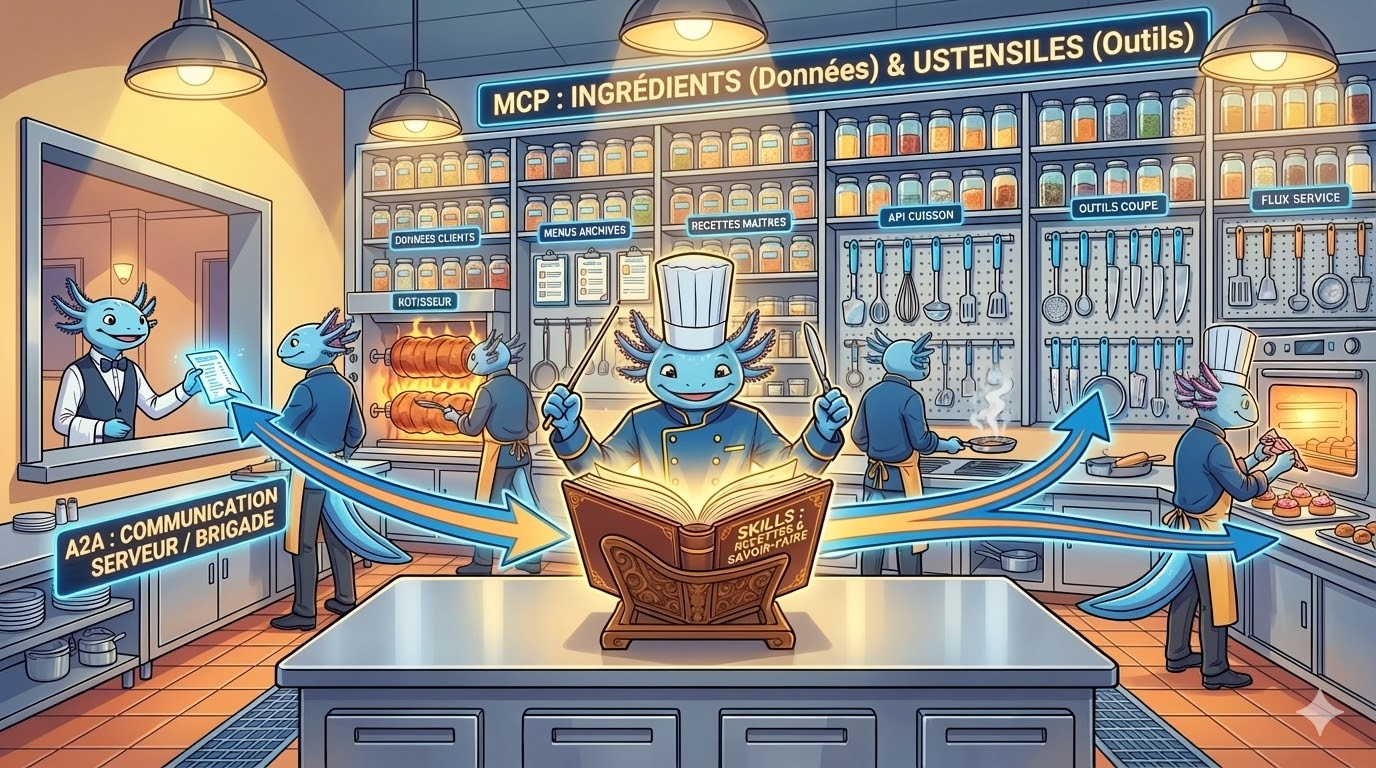 Pour illustrer ces concepts tout au long de l'article, imaginez la création de votre système d'IA comme l'ouverture d'un restaurant étoilé :L'Agent IA = le Chef Cuisinier (Autonome, il réfléchit et agit)Les Skills = les Recettes et le savoir-faire culinaireLe MCP = les Ingrédients (Données) et les ustensiles de cuisine (Outils)L'A2A = la communication entre le serveur en salle et la brigade en cuisine