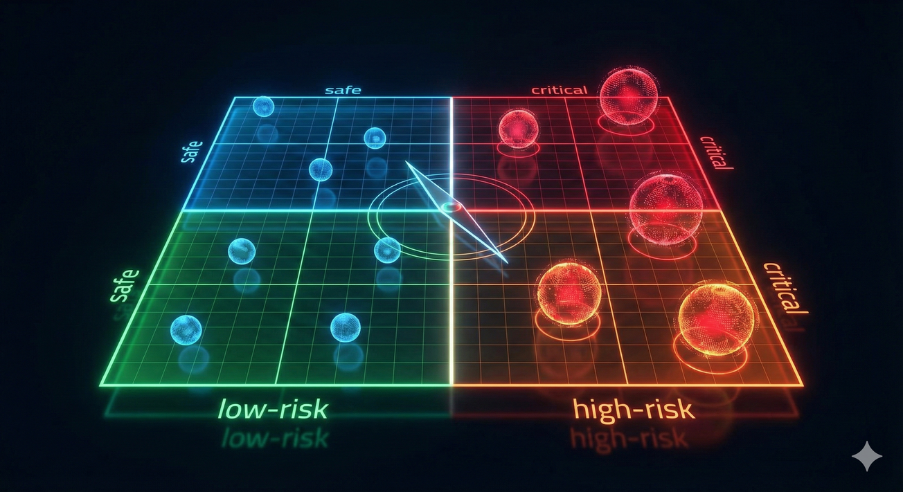 Une fois le type d'IA identifié, comment décider du niveau de contrôle ? Je refuse la bureaucratie par défaut. J'ai donc construit une Matrice de Criticité à deux dimensions pour calibrer la gouvernance.