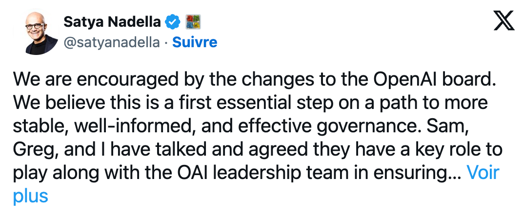 «Ceci est un premier pas essentiel pour aller vers la construction d’une gouvernance plus stable, plus efficace, et mieux informée. Sam, Greg et moi nous sommes mis d’accord sur le fait qu’ils ont un rôle central à jouer dans la direction d’OpenAI, afin que cette entreprise continue de briller et puisse remplir sa mission.»