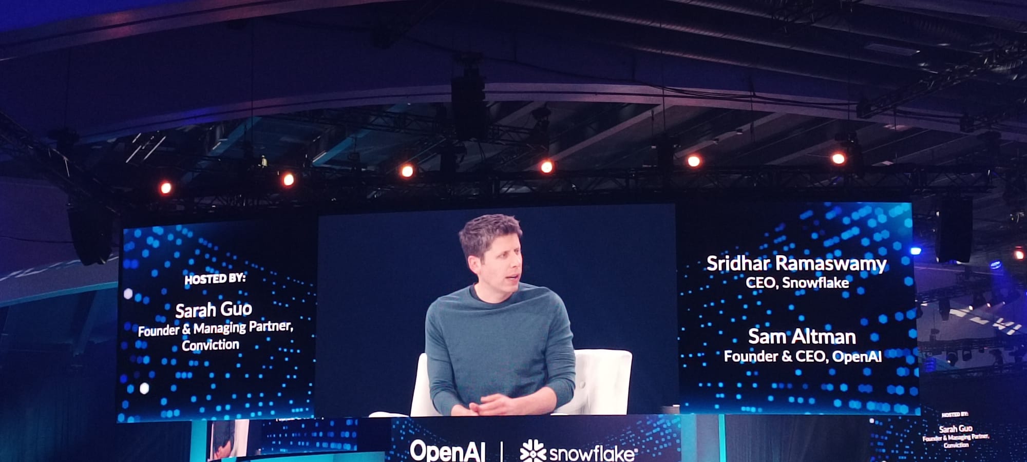 - Opening Keynote : Le Snowflake Summit a débuté en grande pompe avec une keynote animée par Sridhar Ramaswamy, CEO de Snowflake, accompagné d’invités prestigieux tels que Sam Altman (fondateur et CEO d’OpenAI), Lynn Martin (présidente du NYSE) et Casey Wasserman (président de LA2028). Ensemble, ils ont exploré l’impact croissant de l’IA dans le monde des entreprises et le rôle de Snowflake dans cette transformation. Les annonces marquantes :