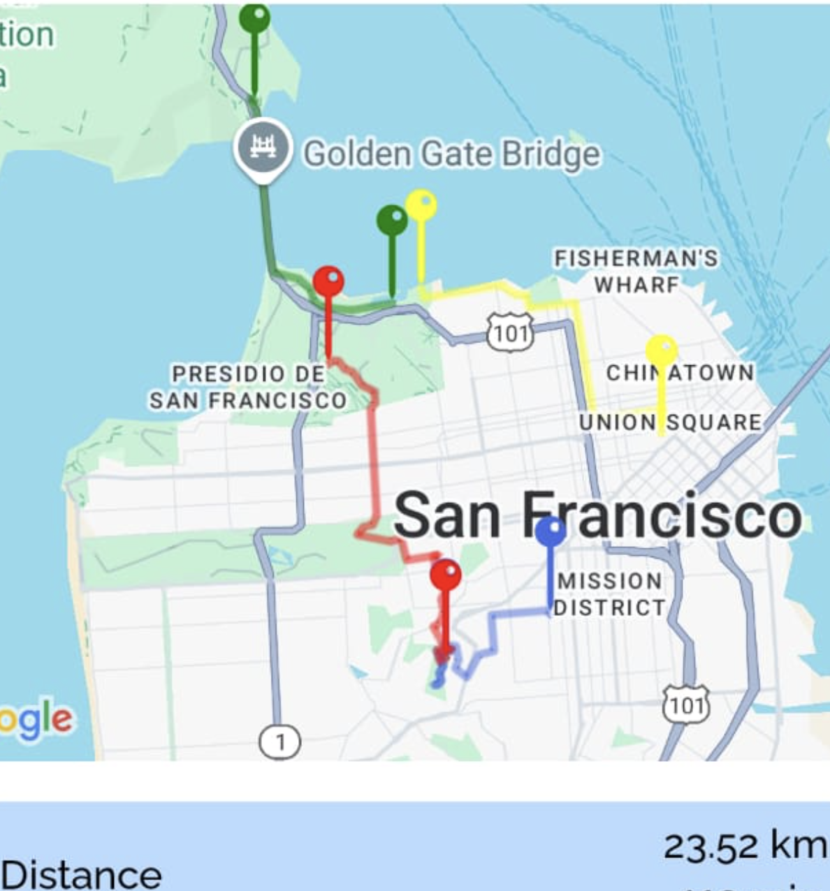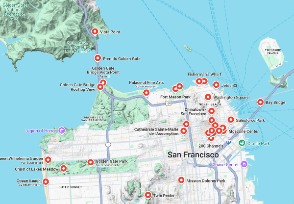 - Une sortie à vélo de 25 km, départ à 7h du matin pour traverser le Golden Gate Bridge. Le vent, les panoramas et la traversée du parc de séquoias ont rendu cette aventure mémorable. Je suis passé par Golden Gate Park et j’ai atteint les Twin Peaks, offrant une vue imprenable sur la ville. Je me suis enfin reposé au Dolores Park avant de laisser mon vélo pour me diriger vers mon avion.