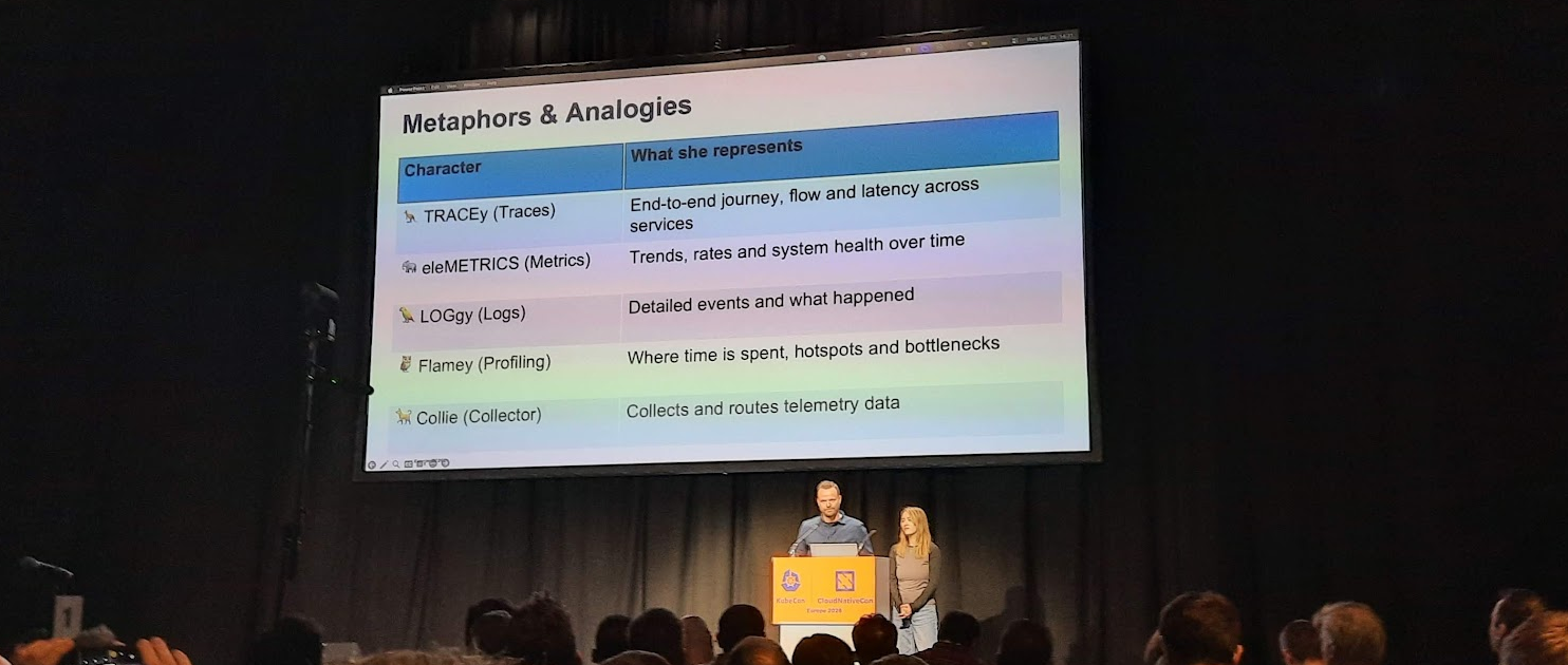 Une session rafraîchissante et particulièrement bien amenée. Les speakers commencent par poser les fondamentaux de l'observabilité de façon didactique et accessible, avec une analogie autour d'animaux qui rend le tout mémorable 🐾 : traces, profiling, logs, métriques, collecte.