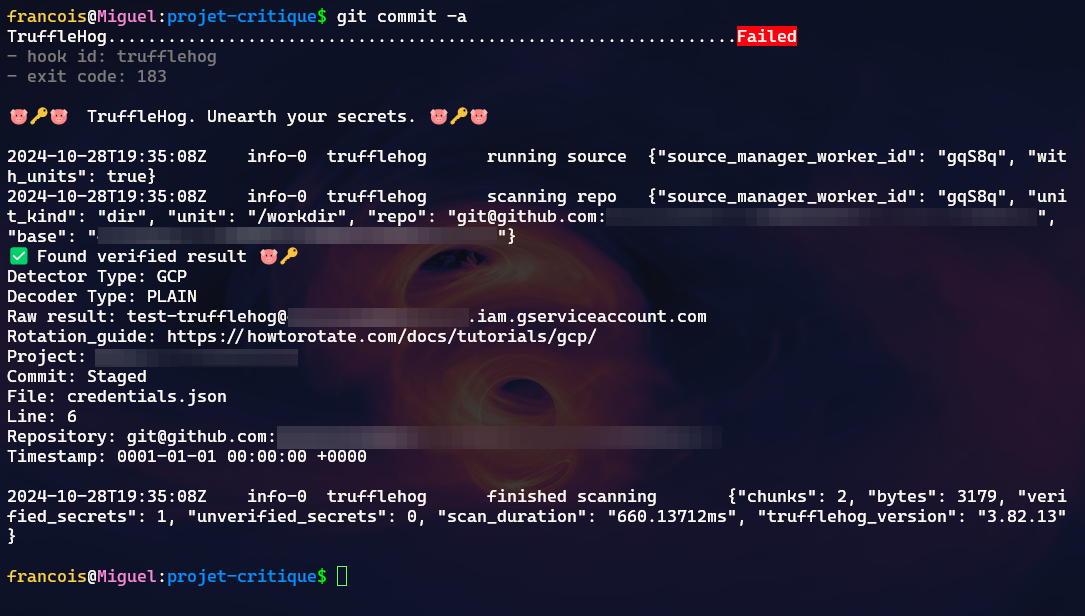 Certes un peu plus compliqué à aborder, on peut faire encore mieux avec TruffleHog puisqu'il est bourré de fonctionnalités[5] et laisse place à tout un tas de personnalisations. De la même façon, on peut s'en servir via pre-commit et docker :