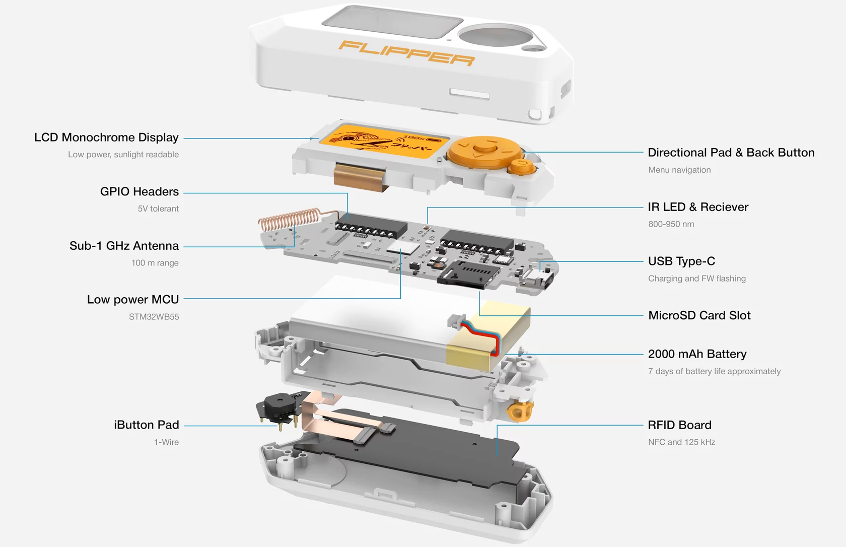 - Support de cartes SD pour étendre la mémoire et stocker signaux radio, dumps de badges et firmwares maison.