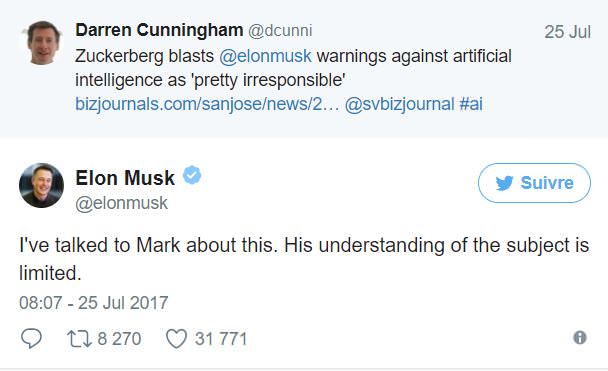 Le créateur de Facebook, Zuckerberg, et le visionnaire Musk, fondateur de Tesla et SpaceX, exprimaient déjà publiquement leur désaccord en 2017 sur l'avenir de l'intelligence artificielle. Zuckerberg qualifiait Musk d'"irresponsable", ce qui provoqua une réplique rapide de ce dernier, affirmant que la compréhension du sujet de Zuckerberg serait "limitée".